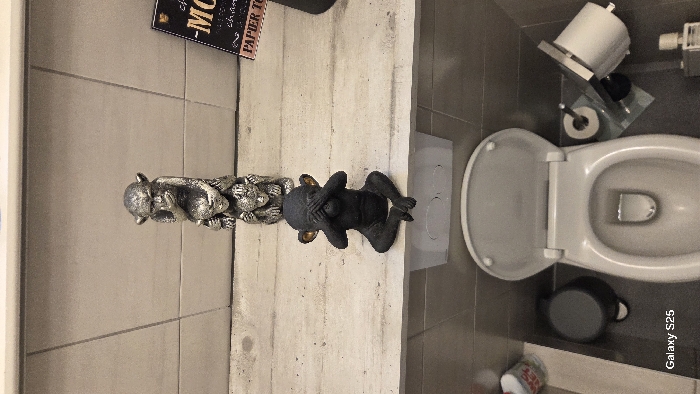 A bathroom scene is depicted from an overhead perspective, featuring a white toilet with its lid ajar. A decorative set of three monkeys—hear no evil, see no evil, speak no evil—sits on a ledge adjacent to the toilet. A roll of toilet paper is visible near the toilet. The bathroom floor is tiled with a combination of gray and concrete-like material. A sign is partially visible on the wall.