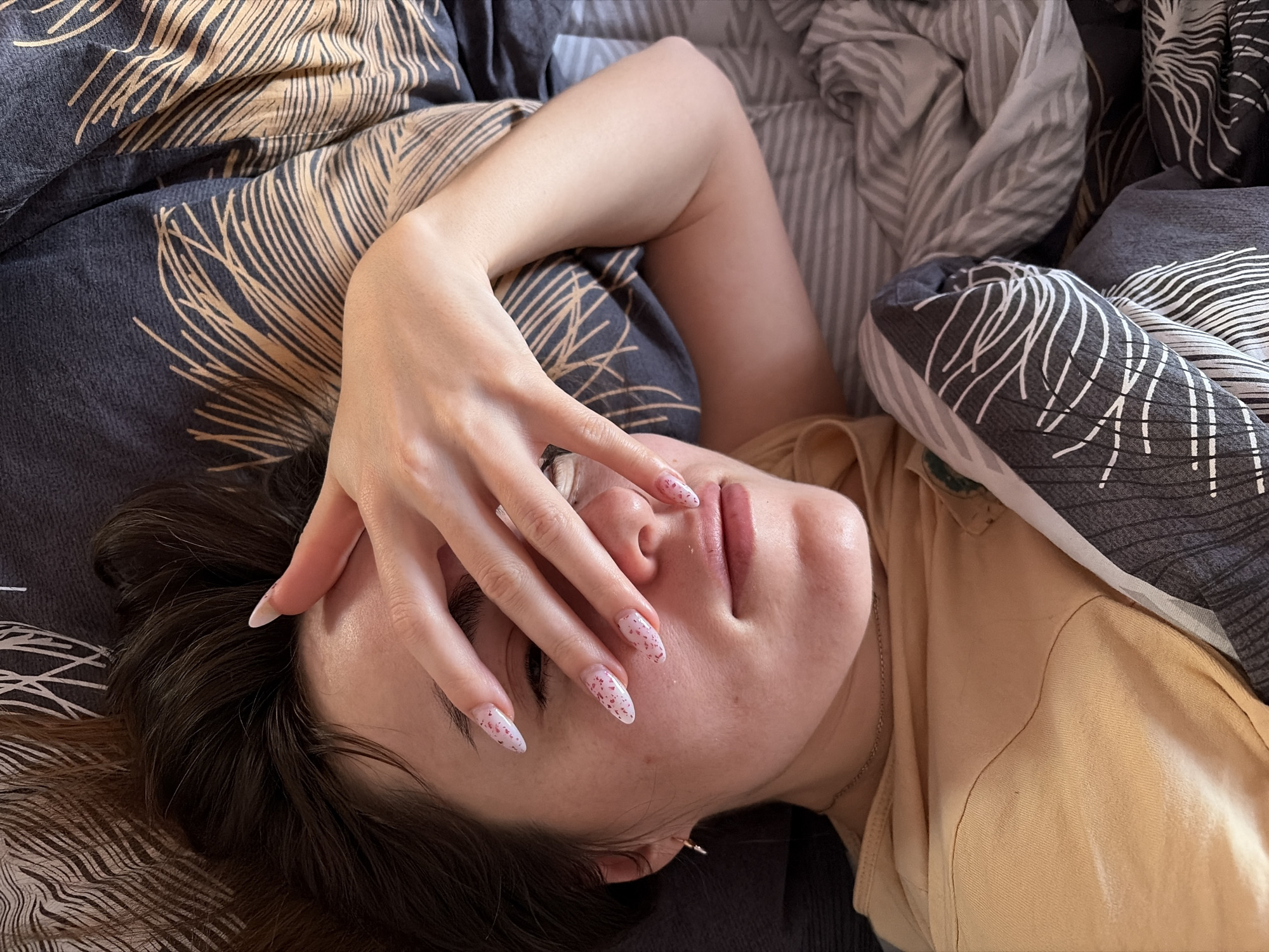 A single individual, identified as an adult female, is depicted lying in a bed within an indoor residential setting in Izhevsk, Russia. The subject's dark brown hair is visible, resting against a dark gray pillow with a light brown feather-like pattern. Her right hand, featuring almond-shaped fingernails with a light pink base and red speckled design, is positioned over her face, covering the eyes and forehead. The lips are slightly parted. She wears a light peach-colored top and a thin silver chain necklace. The bedding includes the patterned pillow and a duvet composed of sections featuring both the feather pattern and light gray stripes. Natural light illuminates the scene from the left.