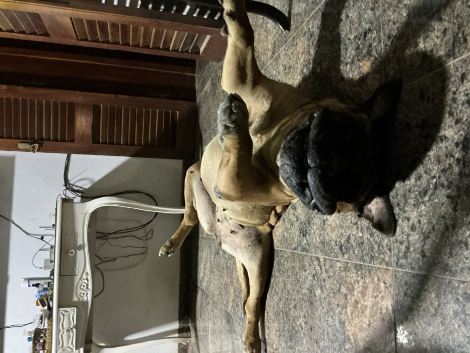 - "An interior scene in El Hueco, Argentina, depicts a fawn-colored dog, possibly a Bullmastiff, lying supine on a tiled floor" by FM-Iw4H22, licensed under CC BY 4.0