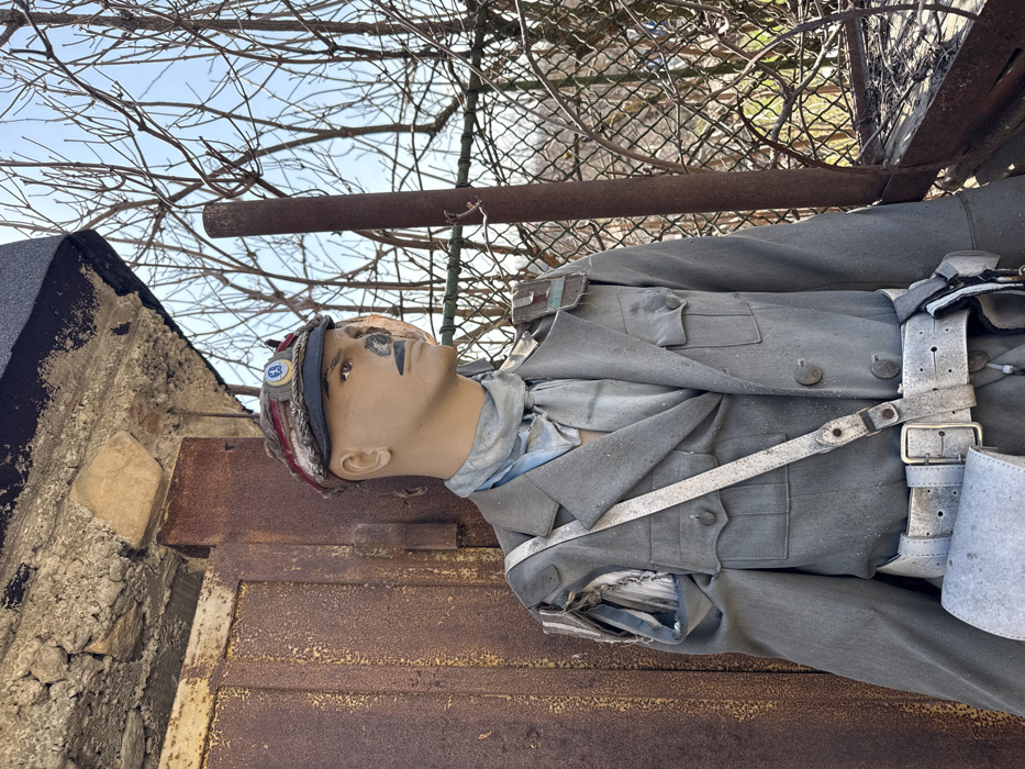 The image depicts a weathered military mannequin standing outdoors in Gabrovdol, Bulgaria