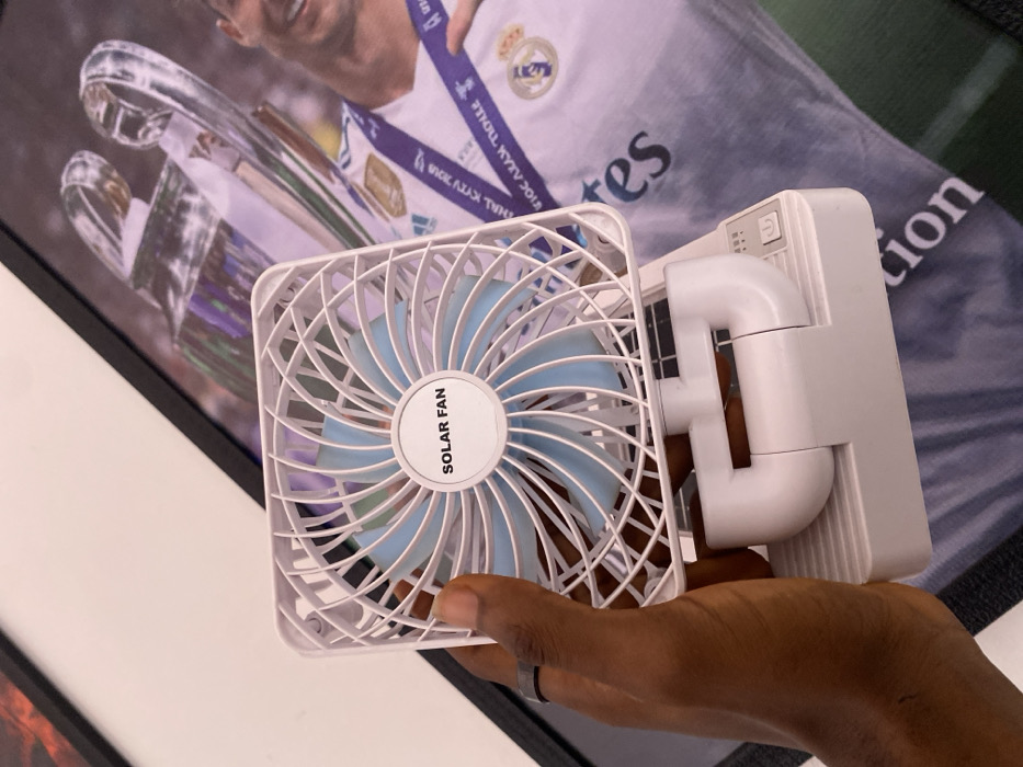 A dark-skinned right hand, wearing a dark ring on the ring finger, holds a white portable "SOLAR FAN" with light blue blades and a foldable base
