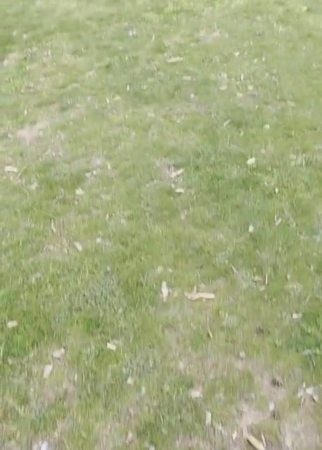grassy park area with trees. There is a picnic table and a merry-go-round visible in the distance. A paved path winds through the trees. The camera is moving.