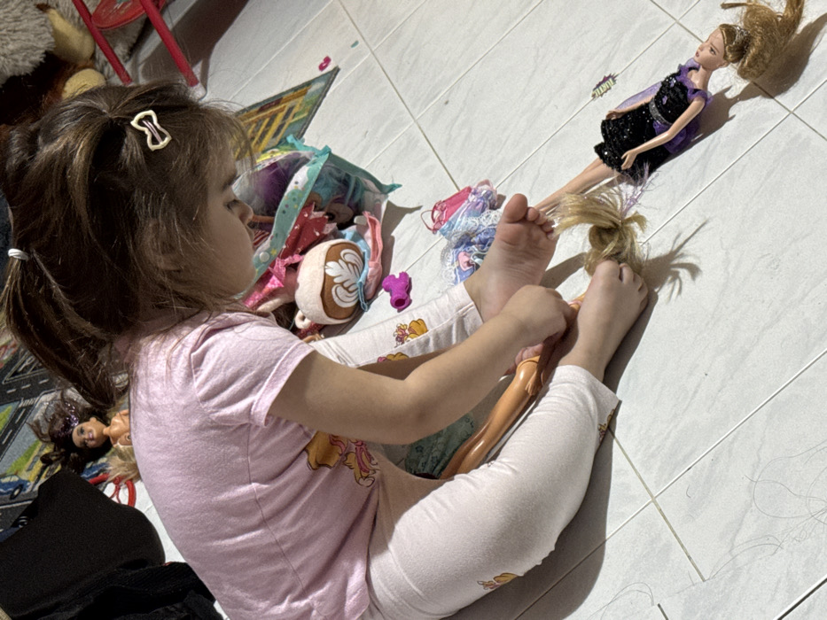 - "A young girl with a ponytail and a hair clip sits on a tiled floor, surrounded by toys, including several Barbie dolls" by FM-ce9dH2, licensed under CC BY 4.0