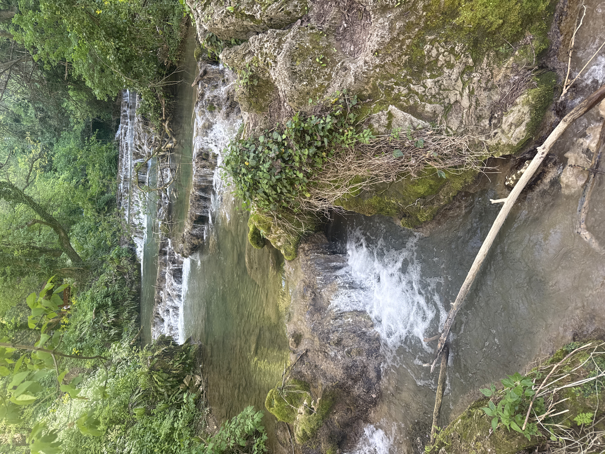A high-angle, long-distance shot depicts a cascading waterfall in Krushuna, Bulgaria. The water flows down rocky terraces, forming small pools and creating white foam as it drops. Green vegetation, including trees, bushes, and moss, lines the banks and rocky outcrops. A fallen branch lies in the water on the right side of the image.