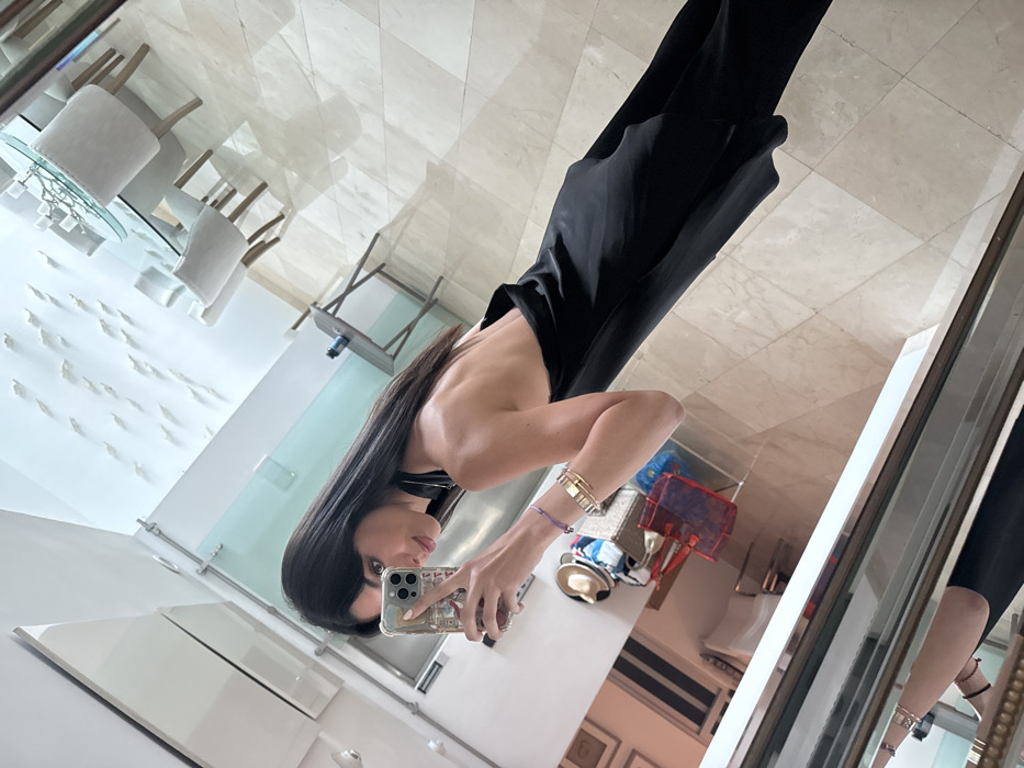 A woman in a black outfit takes a mirror selfie with her iPhone. She is posing indoors. In the background, furniture and decorations are visible, including chairs, a table, and wall art featuring white shapes. The room appears modern with light-colored floors and white walls. The woman's outfit includes a top and pants or a jumpsuit. She is wearing bracelets. The image is rotated, giving a tilted perspective.
