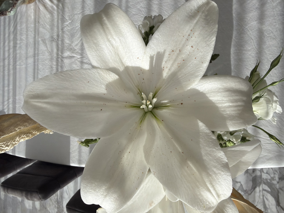 An overhead view within a building in Huixquilucan de Degollado, Mexico, depicts a large white flower arrangement on a white table surface. The central subject is a fully bloomed, six-petaled white flower, possibly an amaryllis or lily, positioned centrally and filling a significant portion of the frame. Its petals exhibit slight textural variations and contain numerous small, reddish-brown speckles. The flower's pistil and stamens in the center are pale green and white. Beneath and around the main flower, smaller white floral elements and several closed green flower buds are partially visible. The table is covered with a creased white fabric, likely a tablecloth. Strong, directional sunlight casts distinct horizontal parallel shadows, consistent with light passing through window blinds, across the white fabric, particularly on the right side. Additional shadows from the flowers are also present. In the upper left background, dark, upholstered furniture, specifically parts of chair backs, is visible. Adjacent to this, a white geometric object, possibly a vase or stand, and a beige, textured, dried natural element (possibly a palm frond) are partially seen. No individuals are present or engaged in any actions within the scene.