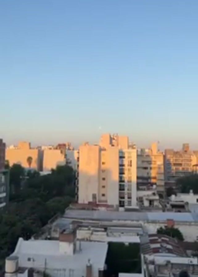 cityscape at what appears to be either dawn or dusk, with sunlight casting a warm glow on the buildings. The sky is a clear blue, with a faint moon visible. There are a number of apartment buildings in view, of varying heights and architectural styles, interspersed with trees. Birds are seen flying across the sky. The camera is static.