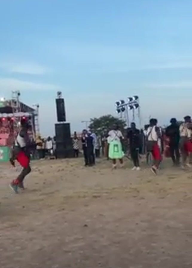 group of people performing a traditional dance in an outdoor setting, with a stage set up in the background. Dancers in red shorts and off-white tops perform in a circle, while others, in everyday clothing, watch. A few people appear to be filming the event. The setting looks like an open field, with a stage and lighting equipment suggesting a public event. The sky is clear and blue, indicating it is daytime.