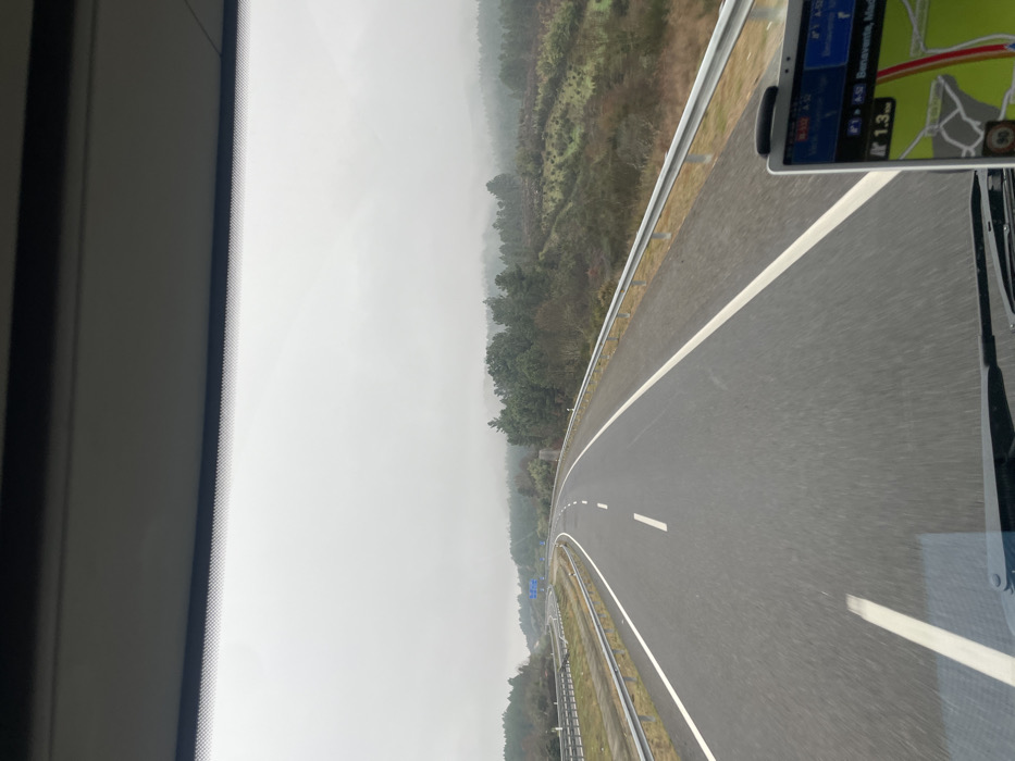 The image depicts a view from the interior of a vehicle traveling eastbound on a multi-lane highway, likely the A-24 in the vicinity of Chaves, Portugal, heading towards the Spanish border. The GPS device visible on the lower right of the windshield indicates a route towards "A-52 Benavente, Madri" and "Vigo A-52," with a distance of "1.3 mi" to an unspecified point on the route. The scene is dominated by a two-lane asphalt highway featuring white solid edge lines and white dashed lane dividers, suggesting a single direction of travel. Metal guardrails line both sides of the roadway. A blue highway sign is partially visible in the distance on the left side of the road. The vehicle's windshield, dashboard, and a portion of the interior roof lining are visible in the foreground. No individuals are discernible. The environment is characterized by a rural, hilly landscape under heavy overcast or foggy conditions, resulting in a uniformly gray sky. The hills flanking the highway are covered with a mix of evergreen trees and bare deciduous vegetation, some displaying reddish-brown tones. The distant terrain is obscured by mist or low clouds. The overall impression is one of movement along a highway through a forested, undulating landscape on a dim, possibly damp, day.
