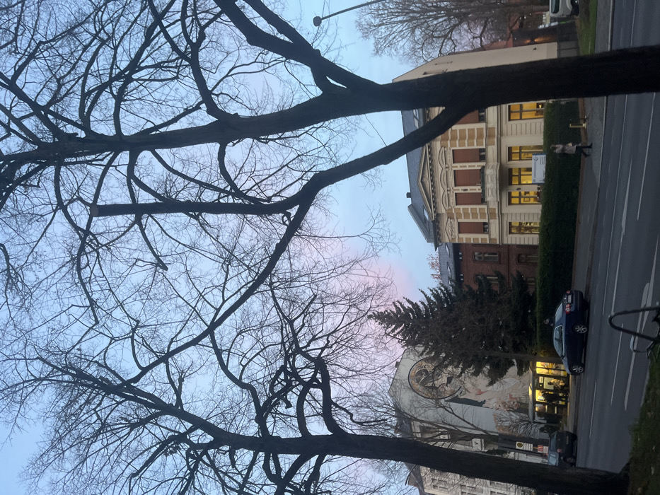 Bare tree branches fill the left frame, contrasting with a pale sky tinged with pink. To the right, buildings line a street, featuring diverse architecture, including a yellow-toned building with multiple windows and a red brick structure. A dark blue car is parked along the road. A mural is visible on the side of a building. The overall scene captures an urban landscape during dusk or dawn.