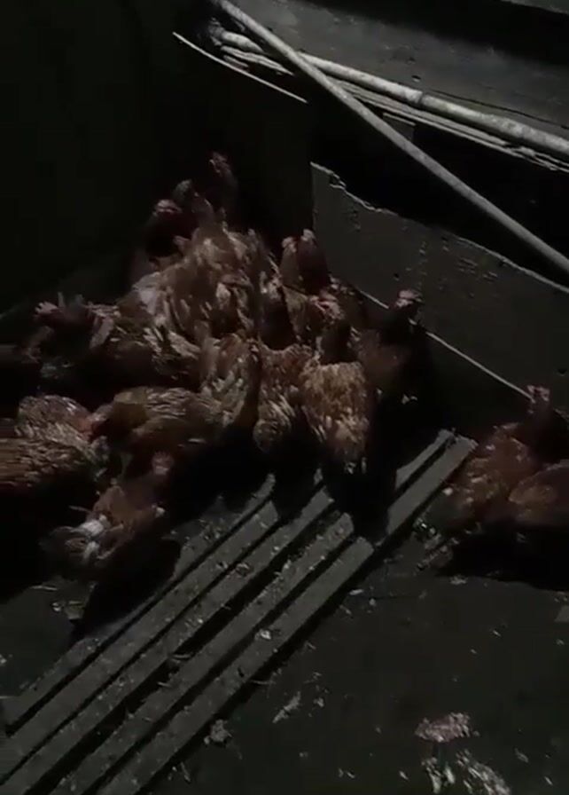 close-up view of a group of brown chickens huddled together in a dark, enclosed space. The floor appears to be made of wooden slats. Some pipes are visible in the background. The chickens are mostly still, although some are moving slightly. The overall lighting is dim.