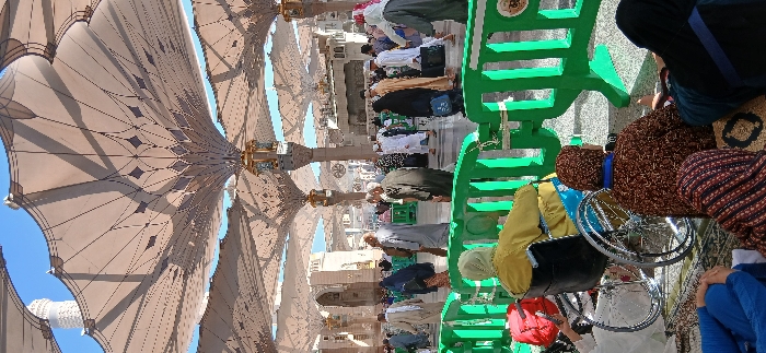 - "The image depicts an outdoor scene in the courtyard of Al-Masjid an-Nabawi (The Prophet's Mosque) in Medina, Saudi Arabia, identified by the distinctive large, retractable fabric umbrellas and a visible minaret against a clear blue sky" by FM-DHzUs1, licensed under CC BY 4.0