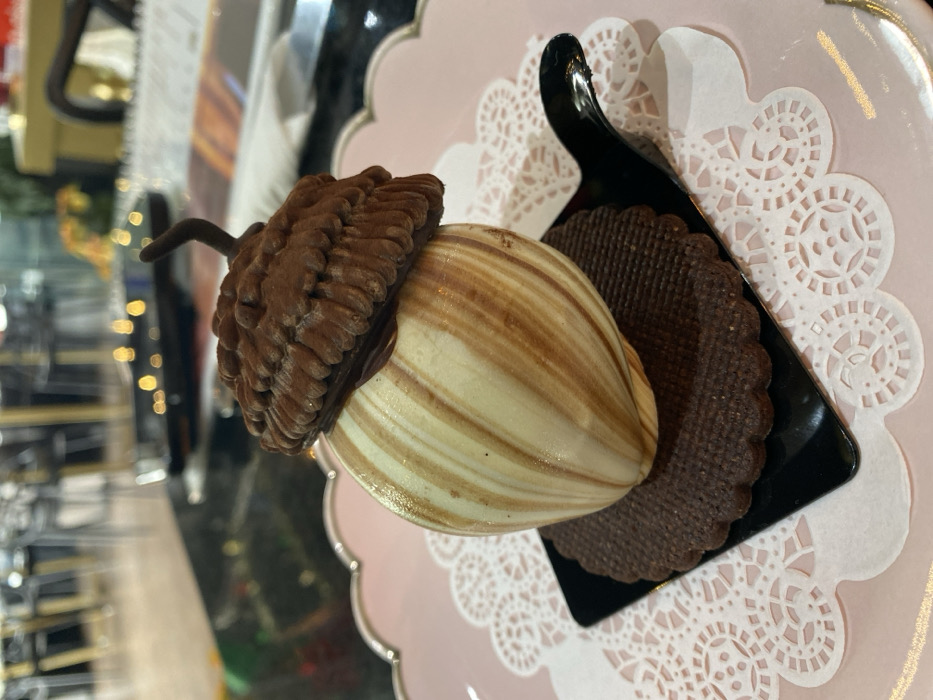 A creatively designed dessert resembling an acorn rests on a pink plate adorned with a white doily. The acorn features a textured brown chocolate top, representing the cap, and a striped tan and white base, mimicking the nut. It is placed on a small, round, dark brown biscuit. A black plastic spatula is visible behind the acorn, adding to the presentation. The plate has a silver scalloped edge. The dessert's intricate details and presentation suggest a gourmet or professionally crafted item.