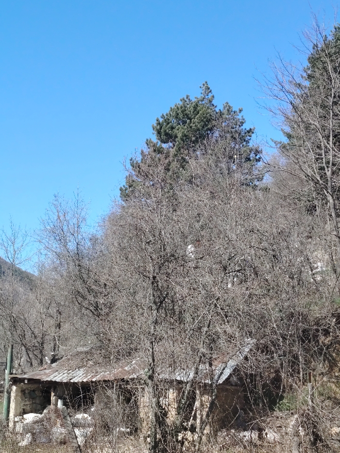 This image depicts a rural, mountainous scene in Vlado Trichkov, Bulgaria, under a clear, bright blue sky. The foreground and midground are heavily populated with dense, leafless deciduous trees and shrubs, indicating a late autumn or winter season. Several evergreen pine trees are visible on a rising incline in the upper right. Partially obscured by the bare vegetation, a dilapidated single-story building is situated in the lower-mid section of the frame. The structure features a heavily corroded, corrugated metal roof and stone and plaster walls exhibiting significant disrepair, with visible structural damage and debris. No distinct windows or doors are clearly discernible. Scattered white, spherical objects, resembling ceramic insulators, are faintly visible amidst the bare branches in the central and upper-central areas. A slender, vertical pole or post is barely visible on the far left. No individuals or animate subjects are present, and no actions or interactions are depicted. The scene is illuminated by direct sunlight.