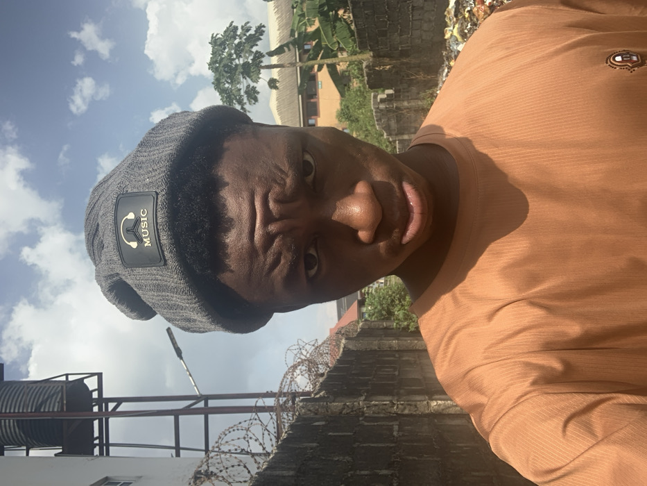 This image presents a close-up, chest-up selfie of a young Black male located outdoors in Eziobodo, Nigeria, under bright daylight with a partly cloudy sky