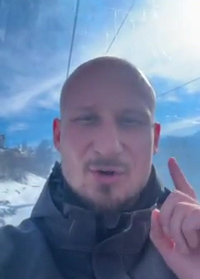 bald man with a short beard inside a cable car. He is wearing a gray jacket and black scarf. The background shows a snow-covered landscape, blue sky, and some text written on the glass of the cable car. The man is speaking, saying that snowboarding is dangerous, but he likes it, and smiles.