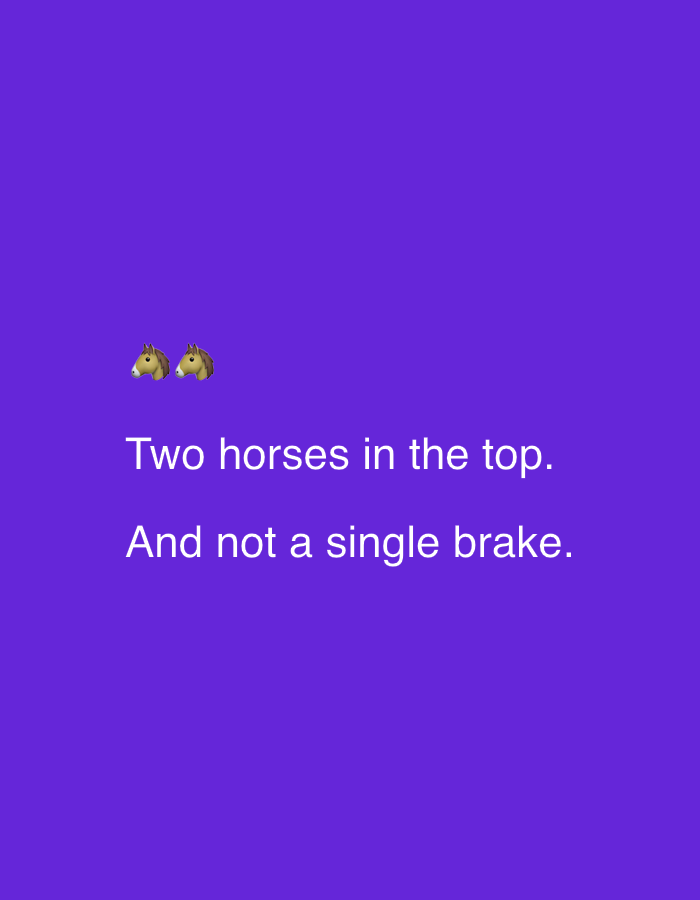 A purple background showcases two horse emojis at the top. Below, the text "Two horses in the top. And not a single brake." is displayed in white. The image plays on the homophones "horses" and "hoarses," as well as "brake" and "breaks," creating a play on words.