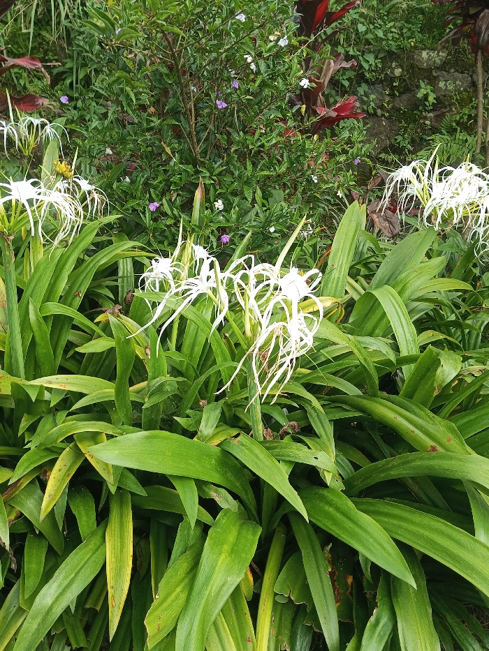 Lush green foliage dominates the scene. Spider lilies with delicate white petals stand out, interspersed among the broad green leaves. A backdrop of mixed greenery includes a bush with small white and purple flowers, along with hints of red foliage. Overall, the image captures a vibrant, natural setting with a focus on the beauty of the spider lilies.