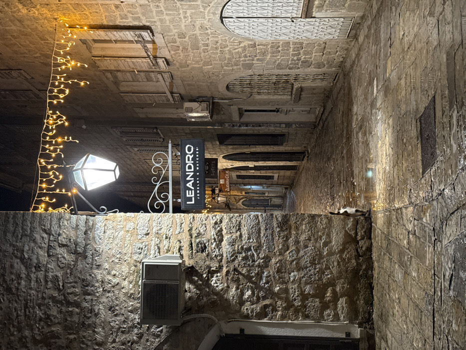 A narrow, stone-paved alleyway at night, framed by weathered stone walls. Buildings with dark shuttered windows and arched entryways loom overhead. A decorative streetlight illuminates a "LEANDRO Jewelry & Watches" sign. Festive lights cascade down the side. An air conditioning unit clings to a wall. A small cat rests on a wall ledge further down the passage.