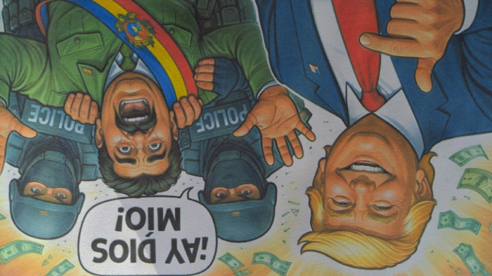 An illustrative political cartoon depicts Donald Trump, smiling with a thumbs-down gesture, surrounded by falling money. Across from him, Nicolás Maduro, with a green military uniform and sash, shouts in apparent distress. Two armed policemen clad in black helmets flank Maduro. A speech bubble near them reads "¡Ay Dios Mío!" seemingly aimed towards Trump's side.