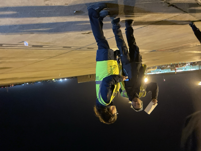 Two individuals stand on an airport tarmac at night. One person holds a document, while the other uses a mobile phone. Both wear dark clothing, and one wears a high-visibility vest. The ground is illuminated by lights, with distant buildings and runway markers visible. A dark sky occupies the upper portion of the image.