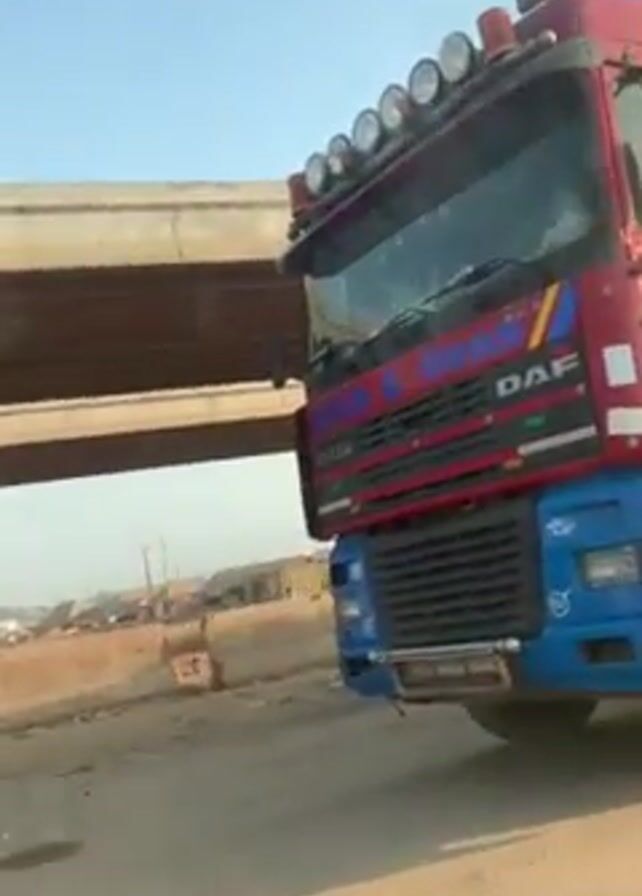 red and blue DAF truck passing under an overpass. The overpass is made of concrete and is still under construction. Under the overpass, there is a silver car with its hood open, and three people are standing around it. A red motorcycle is parked nearby. Two construction workers are also visible, sitting on a concrete barrier. The environment appears to be a construction site or a roadside area. The sky is clear and blue.
