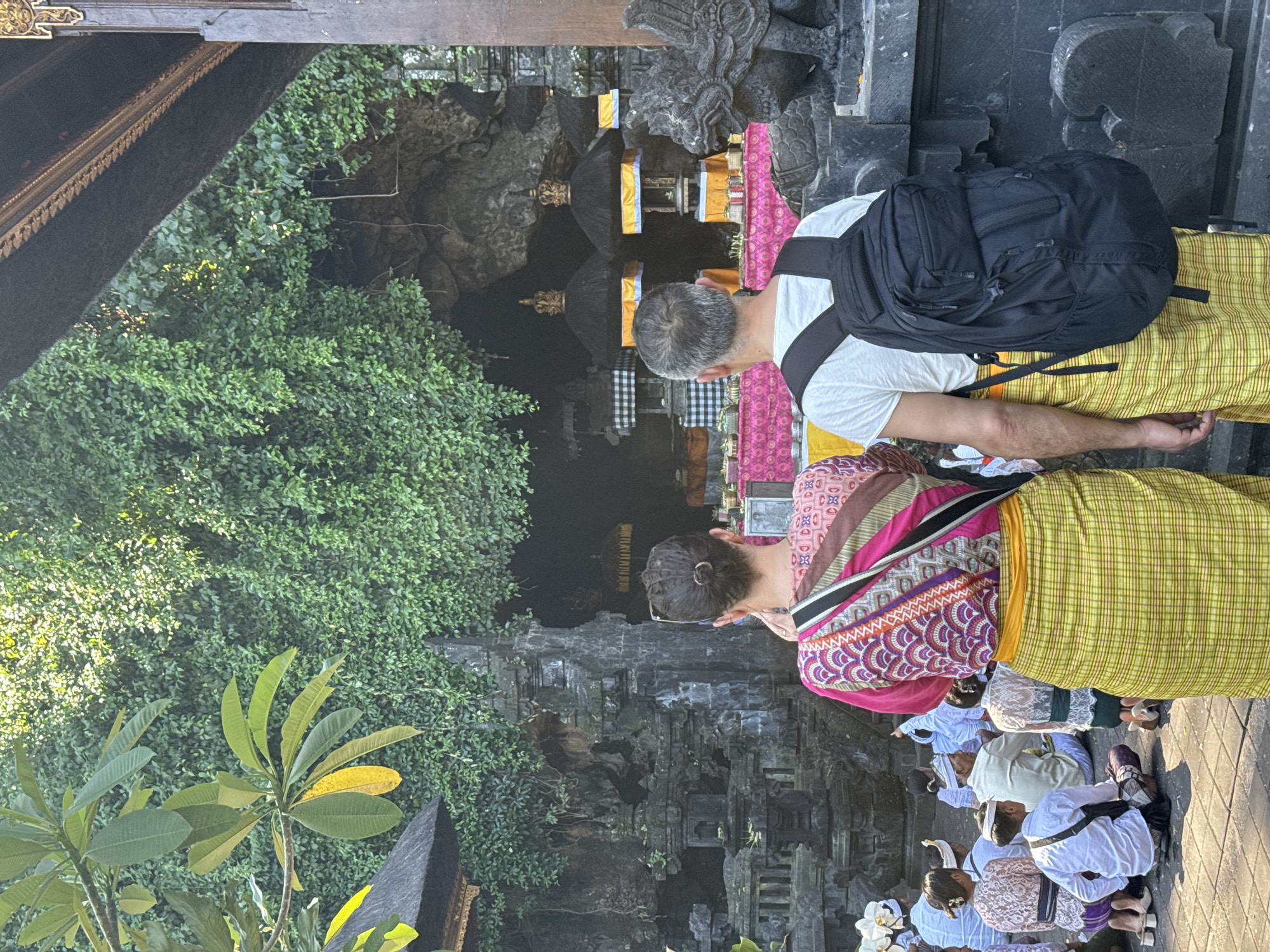 partial view of Goa Lawah Temple (Bat Cave Temple) in Pesinggahan, Indonesia. Two tourists, a man with a backpack and a woman in a patterned top and sarong, are standing at the entrance. They face the temple, which appears to be a cave entrance with shrines and offerings. In front of them, Balinese people are kneeling and praying in white clothing. The temple is surrounded by dense green vegetation. The image is taken outdoors in daylight.