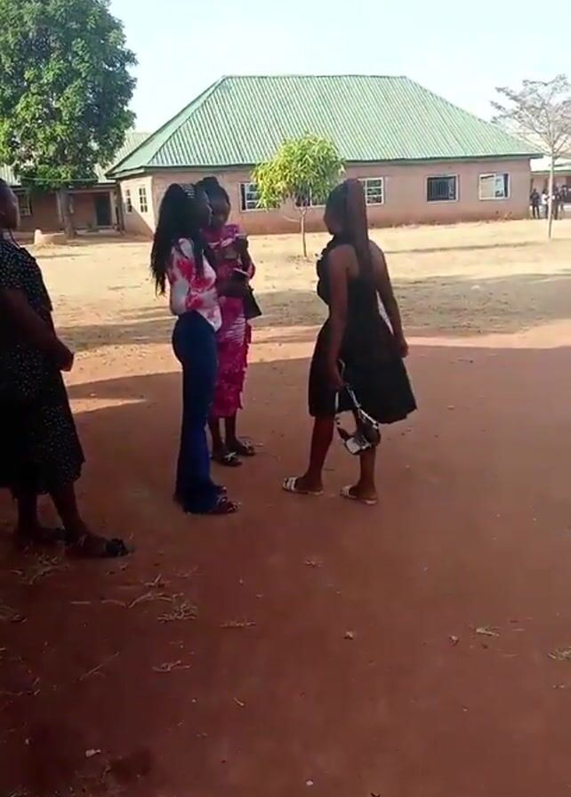 Four women stand in a group in front of a building with a green roof. One woman is wearing a black dress, one is wearing a pink dress, one is wearing a patterned shirt and blue pants, and the fourth is wearing a black dress with white polka dots. The ground is dirt. A large tree is in the background. The women appear to be talking.