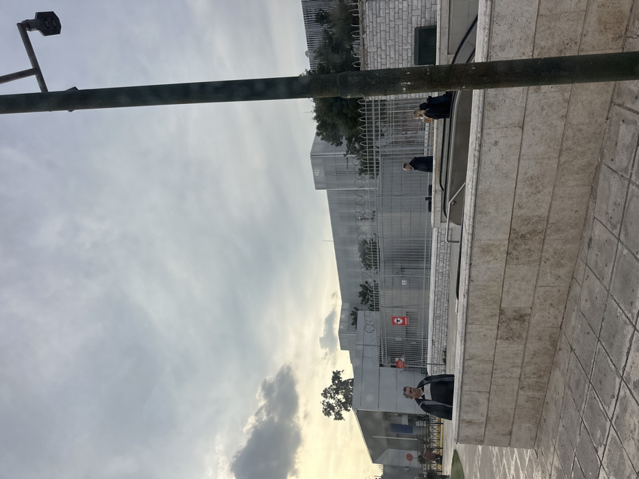 The image depicts an urban scene in Athens, Greece, centered on the United States Embassy building. The embassy, a large, modern structure with a light-toned, horizontally paneled facade, occupies the background, featuring multiple tiers and angles. It is fortified by a tall metal fence topped with concertina wire, behind which evergreen trees are visible. Two red circular "No Entry" signs are affixed to the fence. The sky above is largely overcast with patches of brighter light towards the left horizon. In the mid-ground, a low, light-colored stone-clad wall runs horizontally across the frame. To the right of this wall, two escalators descend into an underground access point, likely a metro station entrance. A dark, vertical utility pole stands prominently on the far right side of the image. Three individuals are visible: a man in a dark jacket and a striped shirt stands in the left-center foreground, facing right and looking towards the viewer. To the right, near the escalators, a second man in a dark coat walks towards the left, appearing to approach the escalator descent. Beside him, a woman with light-colored hair, wearing a dark jacket, also walks towards the left in the direction of the escalators, possibly carrying a light-colored object in her left hand. The foreground consists of a paved sidewalk with square tiles.