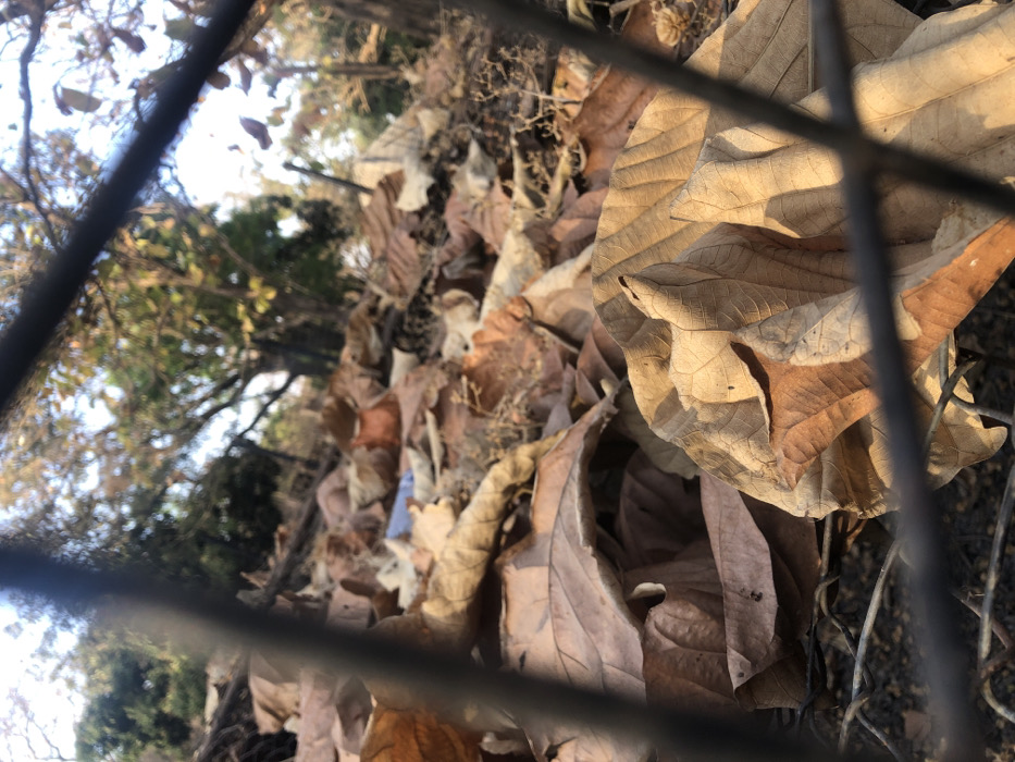 close-up view of fallen leaves, with trees in the background. The leaves are mostly brown and dry, with distinct veins and textures. A wire fence is present in the foreground, partially obscuring the scene. Sunlight illuminates the leaves.