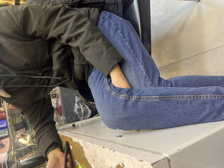 A partial view of an individual seated in an indoor commercial establishment within Barza Municipality, Syria, is depicted. The subject wears a dark green puffer jacket with a light-colored collar over a green hooded sweatshirt and blue denim jeans. The subject's left hand, holding a dark-colored smartphone, rests on a weathered white counter with peeling paint on its top surface. A white plastic zip tie is visibly inserted into a small opening on the vertical face of this counter. The subject's right forearm is visible resting on their lap. In the background, retail shelving units display various packaged products, including what appear to be bottles. A metallic appliance, possibly a kettle, is on the counter to the left, and a dark grey cabinet or unit with a clear plastic bag visible within a receptacle is positioned to the right of the background. The flooring is light-colored.