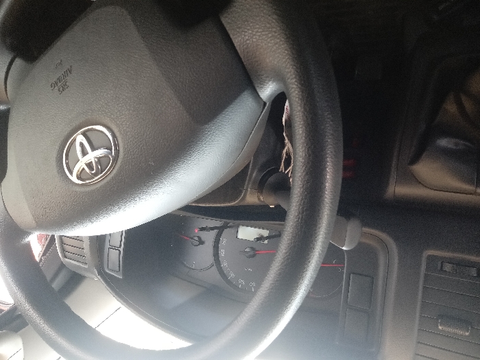 The image depicts the interior of a vehicle, specifically the driver's perspective, located in Majengo ward, Kenya. The foreground is dominated by a black, textured steering wheel featuring a prominent silver Toyota emblem at its center. Below the emblem, the text "SRS AIRBAG" is visible. Behind the steering wheel, the instrument cluster is partially visible, displaying a speedometer calibrated up to at least 180 km/h, with needles at rest, indicating the vehicle is stationary or off. To the left of the instrument cluster, a vertical air vent is present on the dashboard, along with various dark gray plastic panels and controls. A control stalk extends from behind the steering wheel on the left side. No individuals, actions, or direct interactions are visible within the frame. The environment is the enclosed cabin of a vehicle, illuminated by natural light entering from an unseen source, suggesting daytime conditions.