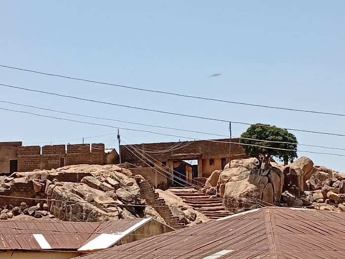 - "The image displays a residential landscape in Jos, Nigeria, characterized by buildings integrated into and atop a prominent granite rocky outcrop under a clear, bright blue sky" by FM-ae3z52, licensed under CC BY 4.0