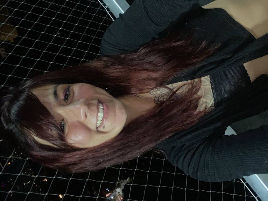 A woman with long, dark auburn hair and bangs smiles at the camera. She wears a black top with lace detail visible at the neckline, under a black cardigan or sweater. A small piercing is visible on her lower lip. A tattoo is apparent on her upper chest or shoulder. A wire mesh or netting forms the background, with distant city lights visible through the openings. The angle suggests she is lying down.