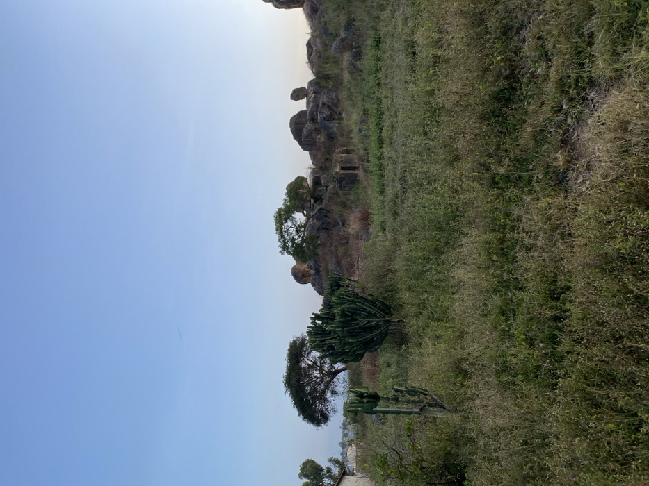 The image displays a rocky, vegetated landscape in Bukuru, Nigeria, under a clear, light blue sky. The foreground features an expanse of dry, light-brown and green grasses and weeds, with a small patch of bare earth evident in the lower right corner. In the midground, several large, multi-stemmed, columnar cactus-like plants are present; one stands prominently on the left, and a denser cluster is located slightly to its right. To the far left, a portion of a light-colored building with a light-colored roof is visible. The background is dominated by a rocky hill or outcrop, characterized by numerous large, dark-colored boulders. Scattered among these rocks are several trees with green foliage, including one with a broad canopy in the left-mid-background and another with an arched canopy positioned atop the rocky formation on the right. A small, dark, rectangular structure, possibly concrete, is nestled within the rocks in the central-background. No individuals or animals are present.