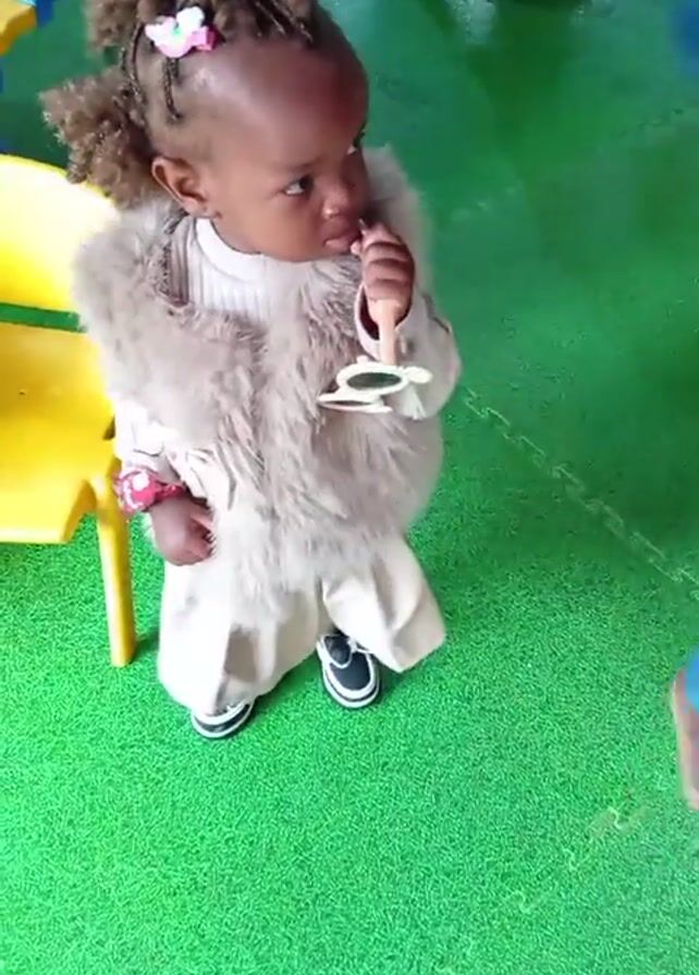young child standing indoors on a green floor mat. The child, who appears to be a toddler, is wearing light-colored pants, a white top, black and white shoes, and a furry vest. The child has brown hair styled with braids and hair clips. The child is holding a pair of toy sunglasses in their hand and appears to be putting them in their mouth. There is a yellow plastic chair to the child's left. Other people are partially visible in the background, but they are not the focus of the video. The environment looks like a play area, possibly a preschool or daycare.