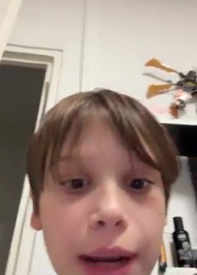 A young boy with light brown hair and a gray camouflage shirt is holding a phone up to his face in a brightly lit room. He first puts his finger up to his mouth and shushes at the camera, then he crosses his eyes. After this he says, “My mom is sleeping, quietly, and I need to.” He then backs away from the camera and smirks. Behind him is a white cabinet and a room with a white door. On top of the cabinet is an orange object and a shelf that holds various toys.