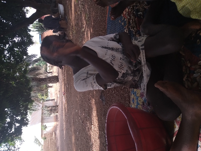 A child sits amidst a group of people outdoors, likely in a rural or semi-rural setting, indicated by the unpaved ground, trees, and a glimpse of a building in the background. The child wears a white t-shirt with text "Eiffel Tour". Nearby, a red basin sits. The people around the child seem engaged in an activity that involves small objects or materials scattered around them. The composition is captured at an angle.
