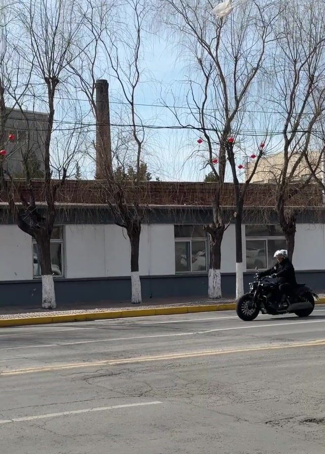 A person in a helmet and dark clothing drives a motorcycle along a road next to a building with a white-and-gray facade. The trees along the road have red spherical ornaments hanging from their branches. A red pole with yellow bands appears on the right side of the screen. As the motorcycle continues moving, a black SUV appears on the left side of the screen.