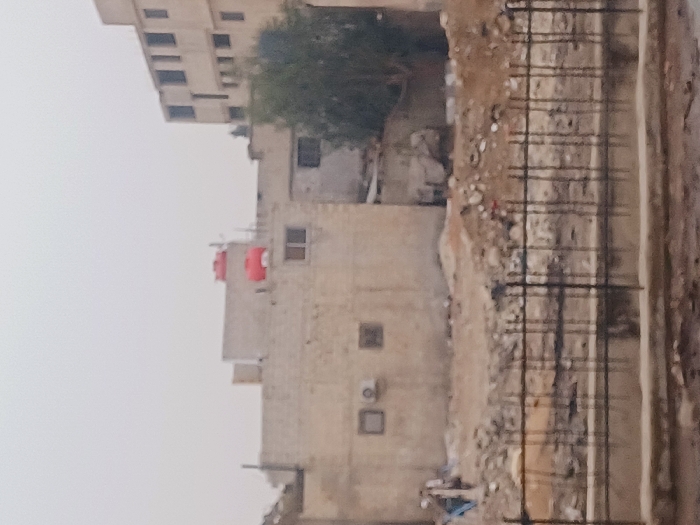 The image depicts an urban demolition or construction site within Kafr Sousa Municipality, Syria, under an overcast sky. In the immediate foreground, a concrete base supports a grid of exposed steel rebar verticals. Directly behind this, the ground is composed of disturbed earth, rubble, and scattered debris, indicative of a cleared lot. To the far left of the midground, two individuals are partially visible. One figure, wearing light-colored clothing, is bent over and appears to be interacting with a prominent blue object, possibly a tarp or container. The second figure is less distinct. Behind these individuals and the disturbed ground, a light-colored, single-story building is visible, featuring two square windows and two external air conditioning units on its facade. In the background, multiple buildings are present. On the roof of a central, lighter-colored building, two red cylindrical water tanks are distinctly visible. To the right, a taller, multi-story building with numerous rectangular windows stands. A small tree with green foliage is situated near this taller structure. The sky above is uniformly light gray.