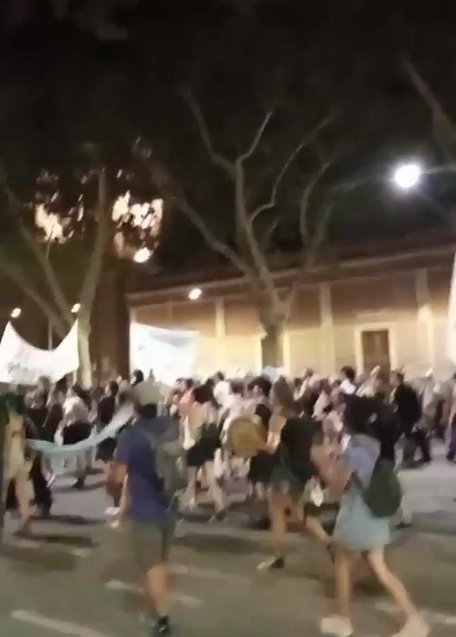 At night, a crowd of people marches down a street