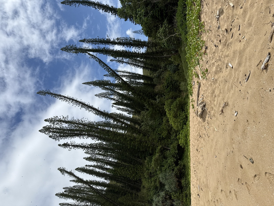 This image displays a natural coastal environment in Bourail, France. The foreground consists of a light tan sandy beach, marked with multiple human footprints and scattered natural debris including pieces of driftwood and small fragments. Towards the right, a patch of green ground-cover vegetation meets the sand. The midground and background are dominated by a dense hillside forest composed primarily of tall, slender, dark green coniferous trees identified as Cook Pines (*Araucaria columnaris*). These trees exhibit a pronounced, uniform lean, predominantly towards the right side of the frame. Beneath the pines, dense layers of mixed green foliage are visible. The sky above is blue with scattered white cumulus clouds, and numerous small dark specks, consistent with distant birds or insects, are visible in the upper expanse. No people or animals are directly depicted.