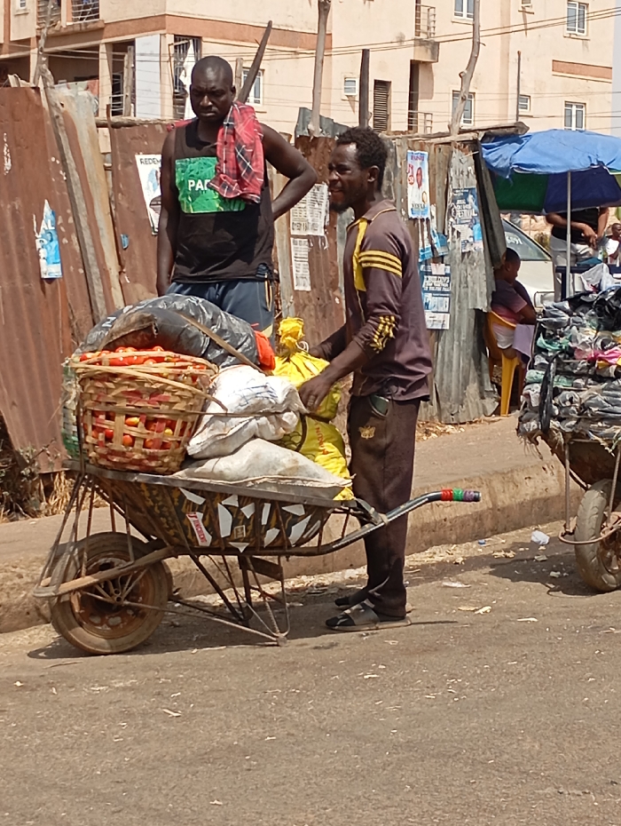 The scene is set on a dusty paved street in Bukuru, Nigeria, under bright daylight. In the foreground, two adult males interact around a heavily loaded, single-wheeled metal wheelbarrow. The wheelbarrow contains a woven basket filled with red spherical produce, multiple black plastic bags, several white sacks, and yellow bags. The wheelbarrow's metal pan is decorated with a geometric pattern in black, white, and brown; its visible handle is wrapped with multi-colored tape. The man on the right, with dark skin and a beard, wears a brown long-sleeved shirt with two yellow stripes on each upper arm, dark trousers, and dark sandals. He stands next to the wheelbarrow, facing left, with his hands positioned near its contents, his mouth slightly open. The man behind the wheelbarrow, to the left, has dark skin and a bald head. He wears a black sleeveless top with "PAC" in green lettering on the chest and dark shorts, with a red and white plaid cloth draped over his left shoulder; he stands with his left hand on his hip. Behind the men and the wheelbarrow, a makeshift barrier constructed from various rusted corrugated metal sheets is visible. This barrier is covered with numerous faded posters and flyers. Beyond the barrier, multi-story beige buildings with multiple windows rise under a clear sky. To the far right of the image, a second, partially obscured wheelbarrow, laden with dark textile goods, is present under a blue and green market umbrella. Several additional individuals are partially visible in the background around this second wheelbarrow and umbrella, including one person seated in a yellow chair.