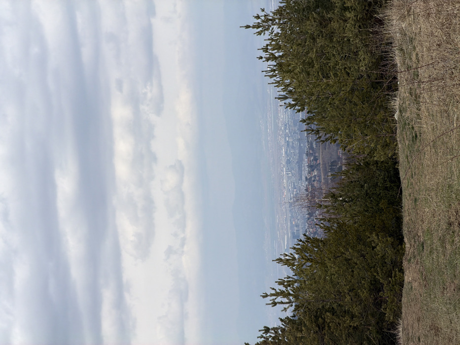 The scene is captured from an elevated position within the Bistritsa region of Bulgaria. The foreground consists of an uneven, dry grassy slope with sparse vegetation. A dense, irregular line of evergreen coniferous trees, predominantly pine, occupies the midground, partially obscuring a vast urban area visible beyond. Several deciduous trees with bare branches are interspersed among the conifers, notably one slender, lighter-barked tree near the left-center of the tree line. The background features a sprawling cityscape, dense with buildings and infrastructure, extending to a distant horizon where faint outlines of mountains are discernible through atmospheric haze. The sky above is entirely overcast with multiple layers of grey stratiform clouds. No human figures or active subjects are present.