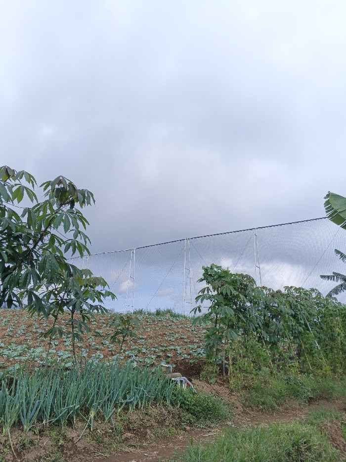 A field of crops under a cloudy sky is captured. A fine mesh net stretched high across the background is supported by vertical posts. The foreground shows rows of green onion stalks and other leafy plants. Young trees with large, palmate leaves are scattered throughout the field. The earth is a mix of brown soil and green vegetation, highlighting an agricultural setting.