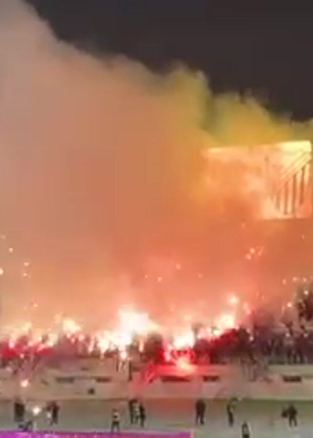 nighttime view of a stadium filled with people, many of whom are holding flares. The flares are emitting bright red and white light, along with thick white and yellow smoke that obscures parts of the stadium. There is a large screen in the background displaying an image that is partially obscured by the smoke. The stadium seating is visible, showing rows of red and green seats. There are people on the field as well, appearing as dark silhouettes against the bright light. The edges of the field are lined with sponsor advertisements. A maroon-colored sleeve or garment appears in the foreground, suggesting the video is taken from the perspective of someone in the crowd.