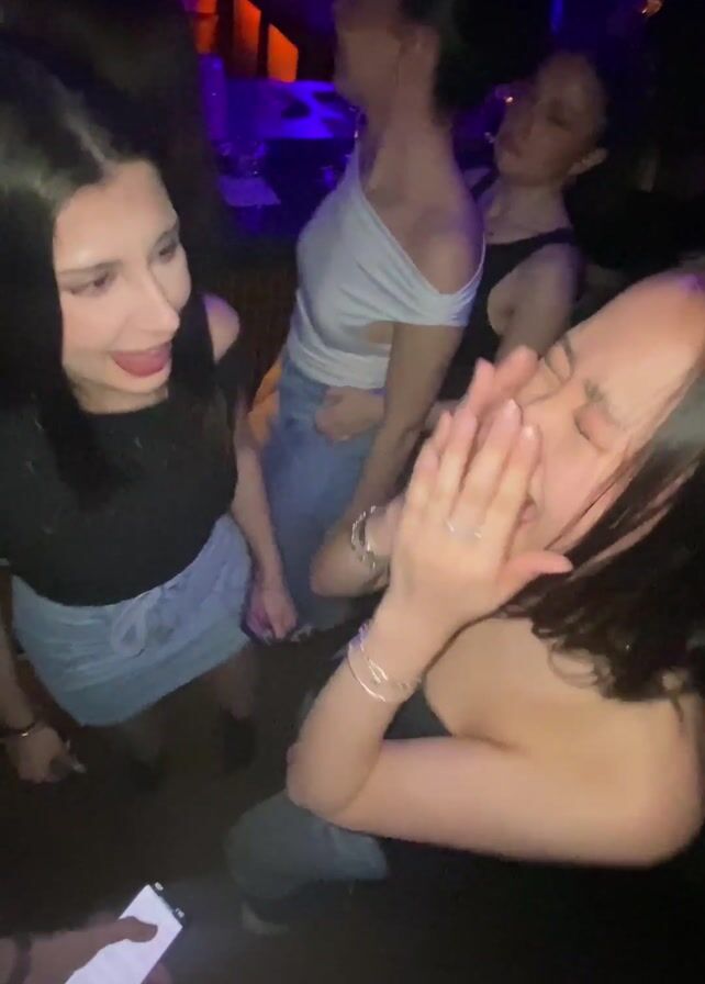 four people dancing in a dark nightclub setting. Two women in the foreground are close to the camera. One woman is wearing a black off-the-shoulder top and a denim mini-skirt. The other woman wears a dark top and several silver bracelets on her left wrist. Both women are moving their hands and smiling. A man in a white shirt and light-colored jeans is dancing with a woman in black behind them. The lighting is dim, with blue and red accents. Someone is holding a smartphone in the lower left corner of the frame. Loud music can be heard.