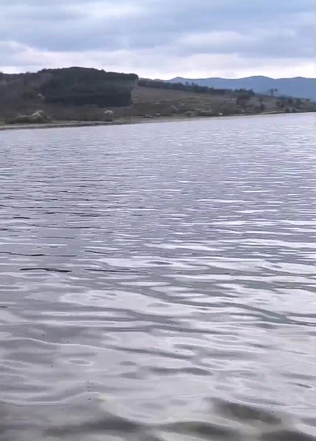 lake shore on a cloudy day. The water is gray and rippled. The shoreline is rocky with green vegetation. In the distance, there are hills and trees. A person appears to be walking in the water near the shore. A vehicle is parked on the grassy area further down the shoreline.