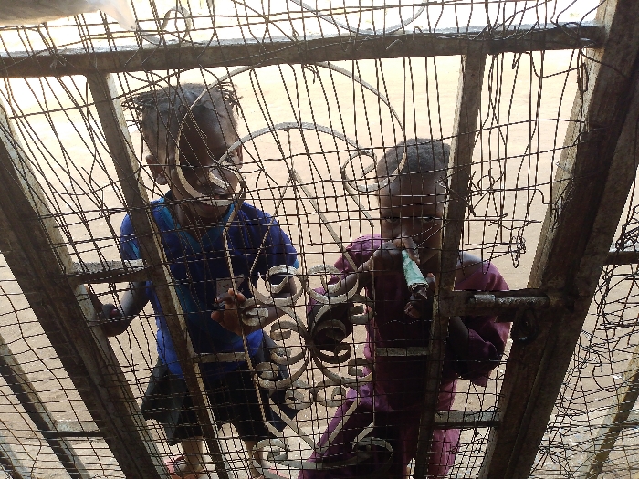 Two children are viewed through a metal grate structure. One child, wearing a blue shirt, stands to the left with hands gripping the grate. The other child, in a pink garment, is to the right, holding an object to their mouth. The grate is heavily wired and patterned with decorative metalwork. The background is a blurry tan color, suggesting an outdoor setting.