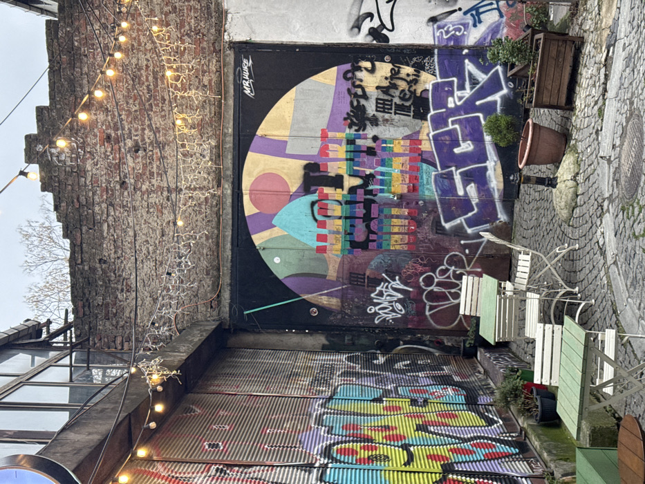 The image depicts an outdoor courtyard in Beyoğlu, Turkey. The ground is paved with cobblestones, featuring a circular metal manhole cover towards the foreground. The left wall consists of corrugated metal, extensively covered in multi-colored graffiti, primarily yellow, green, and purple lettering. Above this wall, a building with large windows is visible. The rear wall is constructed of exposed red brick, partially damaged at its upper edge. The central feature is a dark gate or large door, predominantly adorned with a semi-circular mural of abstract geometric shapes in purple, yellow, pink, and light blue. This mural is overlaid with additional graffiti tags and a rainbow-striped text element, partially legible as "I FEEL." The signature "MR. HUKE" is visible on the upper right of this gate. To the right, a lighter-colored wall is also marked with graffiti. Strings of warm-toned fairy lights and icicle lights are suspended overhead across the scene. On the cobblestone pavement, three light green-topped tables with white foldable metal chairs are arranged. Potted plants and wooden planters containing small shrubs are distributed along the walls and near the furniture. A black bollard with a stone base stands near a brown planter in the mid-ground. No people are visible in the scene.